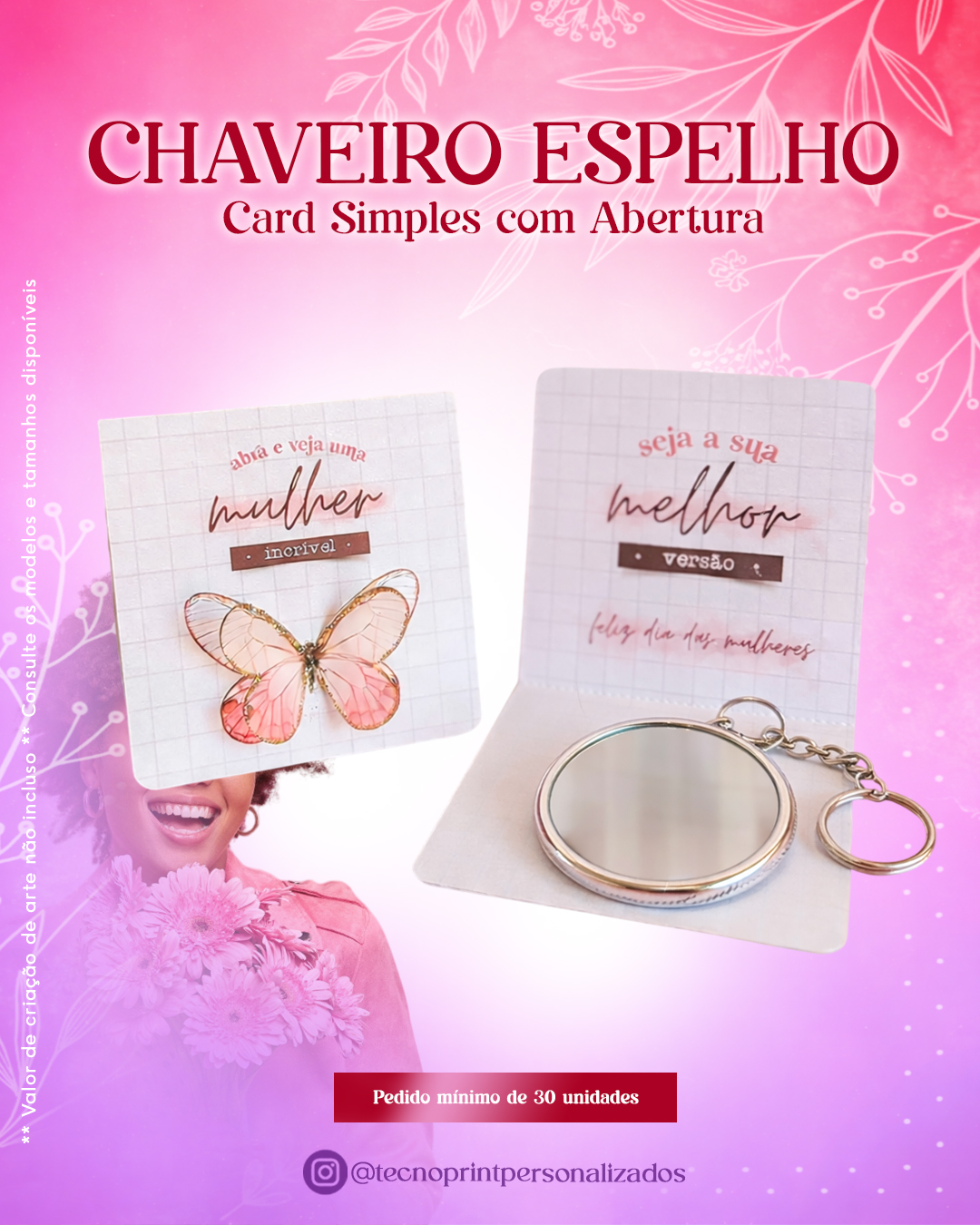 O card com chaveiro espelho de 5,5 cm em francês é a escolha ideal para celebrar o Dia da Mulher com um brinde funcional, delicado e cheio de significado.